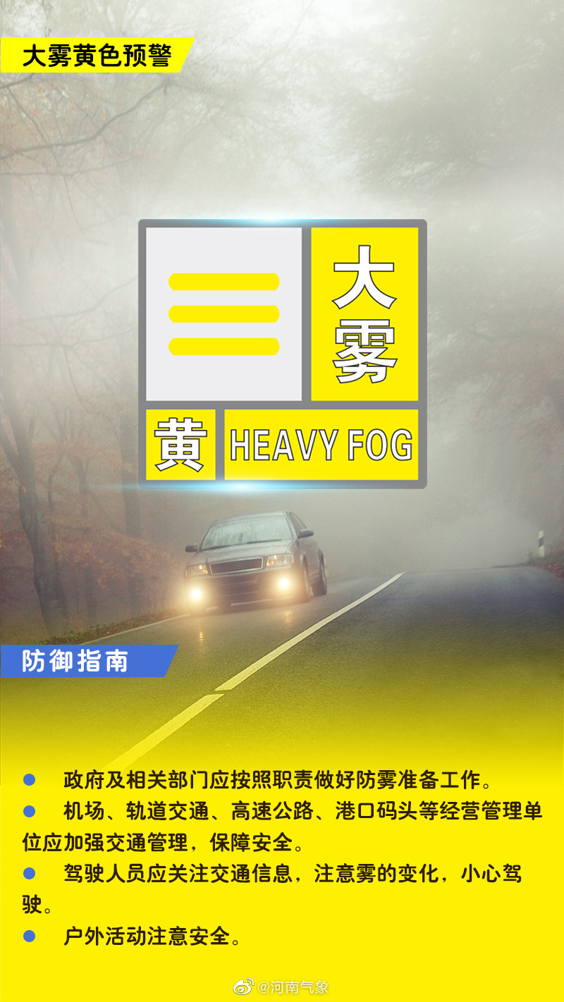 【大河财立方消息】郑州市气象台2022年11月11日15时35分发布大雾黄色预警信号:预计今天傍晚至夜里,郑州市主城区将出现能见度小于500米的雾,局地能见度小于200米。请注意防范。