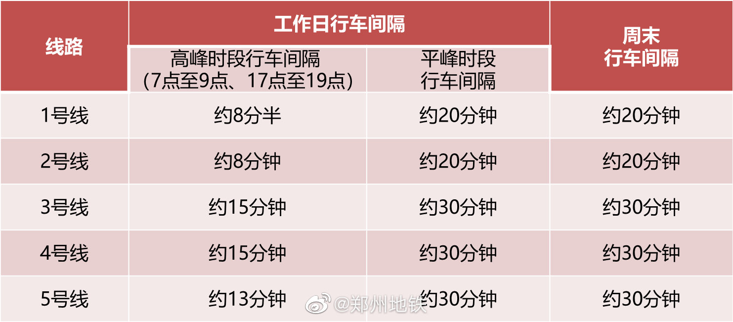 11月21日,大河报·豫视频记者从郑州地铁集团有限公司运营分公司了解到,目前,郑州地铁5条线路85座车站正常运营,运营区段服务时间为7点至21点,线路行车间隔如下表。