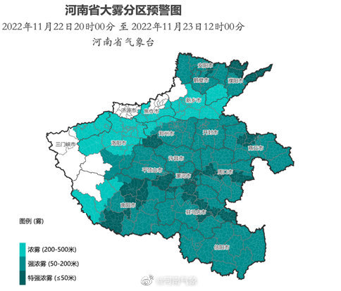 河南省气象台2022年11月22日16时发布大雾橙色预警:预计今天夜里到明天上午,全省大部分县市将出现能见度小于500米的浓雾,其中安阳、濮阳、鹤壁、郑州、开封、商丘、洛阳南部、平顶山、许昌、漯河、周口、南阳中东部、驻马店、信阳能见度小于200米,局地小于50米。请注意防范。防御指南:1.政府及相关部门应按照职责做好防雾工作。2.机场、轨道交通、高速公路、港口码头等经营管理单位应采取有效措施,加强调度指挥,保障安全。3.关注大雾对疫情防控的影响,驾驶人员必须严格控制车、船的行进速度。4.减少户外活动。