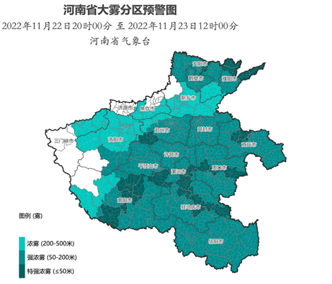 河南省气象台11月22日16时发布大雾橙色预警:预计今天夜里到明天上午,全省大部分县市将出现能见度小于500米的浓雾,其中安阳、濮阳、鹤壁、郑州、开封、商丘、洛阳南部、平顶山、许昌、漯河、周口、南阳中东部、驻马店、信阳能见度小于200米,局地小于50米。