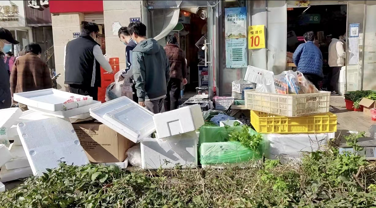 在居民区的一些蔬菜生活超市内,店员最为忙碌。前来购买蔬菜、肉类、粮油等基础生活物资的居民络绎不绝,有的在店内排起了长队。店员忙的不可开交。