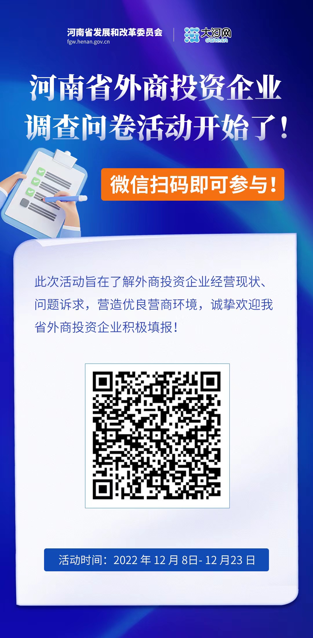 大河网讯 贵司对目前电力、用水等情况如何评价?有无下一步在河南省内布局新项目的计划?……“外商投资企业调查问卷活动”正式开启,对于河南境内的所有外商投资企业,即日起至本月23日期间,均可扫描下图二维码反映企业的经营现状、问题诉求等。