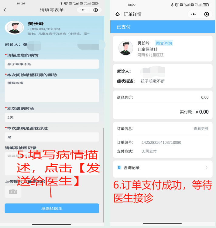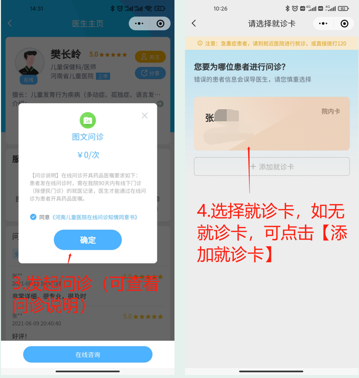 3、选择医生进入【医生详情页】→点击【图文问诊/电话问诊/视频问诊】发起问诊→点击【确定】(可查看问诊说明)→选择【就诊卡】(没有就诊卡的可新建/绑定就诊卡)→输入问题描述(可上传检验检查图片)→点击【发送给医生】→支付问诊费→订单支付成功,等待医生接诊。