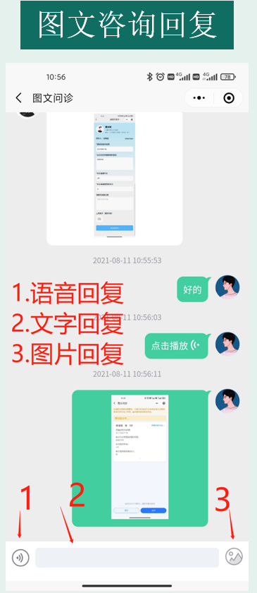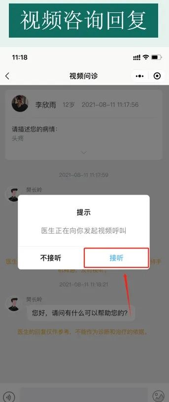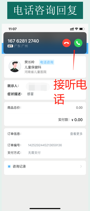 4、等待医生接诊后,可通过图文问诊、电话问诊、视频问诊 的方式与医生进行交流沟通。(注:电话接听过程中调用隐私服务,呈现给医生的电话号码为虚拟号码,保护用户隐私)