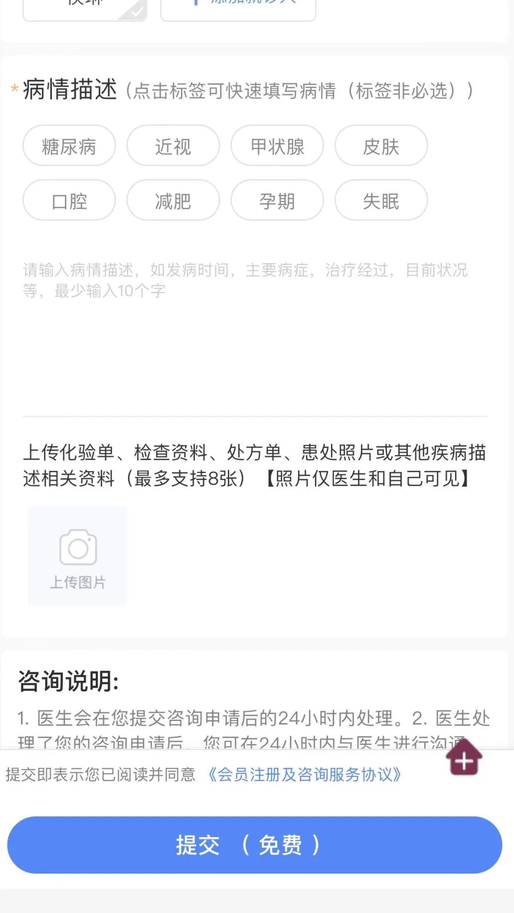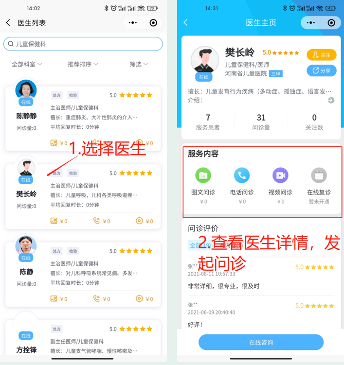 2、点击在线咨询,完成患者建档等流程,选择科室及专家发起问诊。