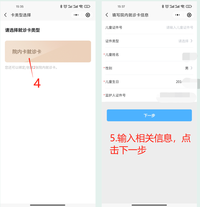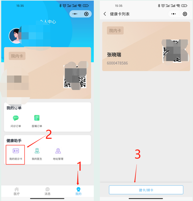 1、在【我的】个人中心→我的就诊卡→点击【建卡/绑卡】→选择【卡类型】→输入儿童及监护人信息,按提示建卡/绑卡。