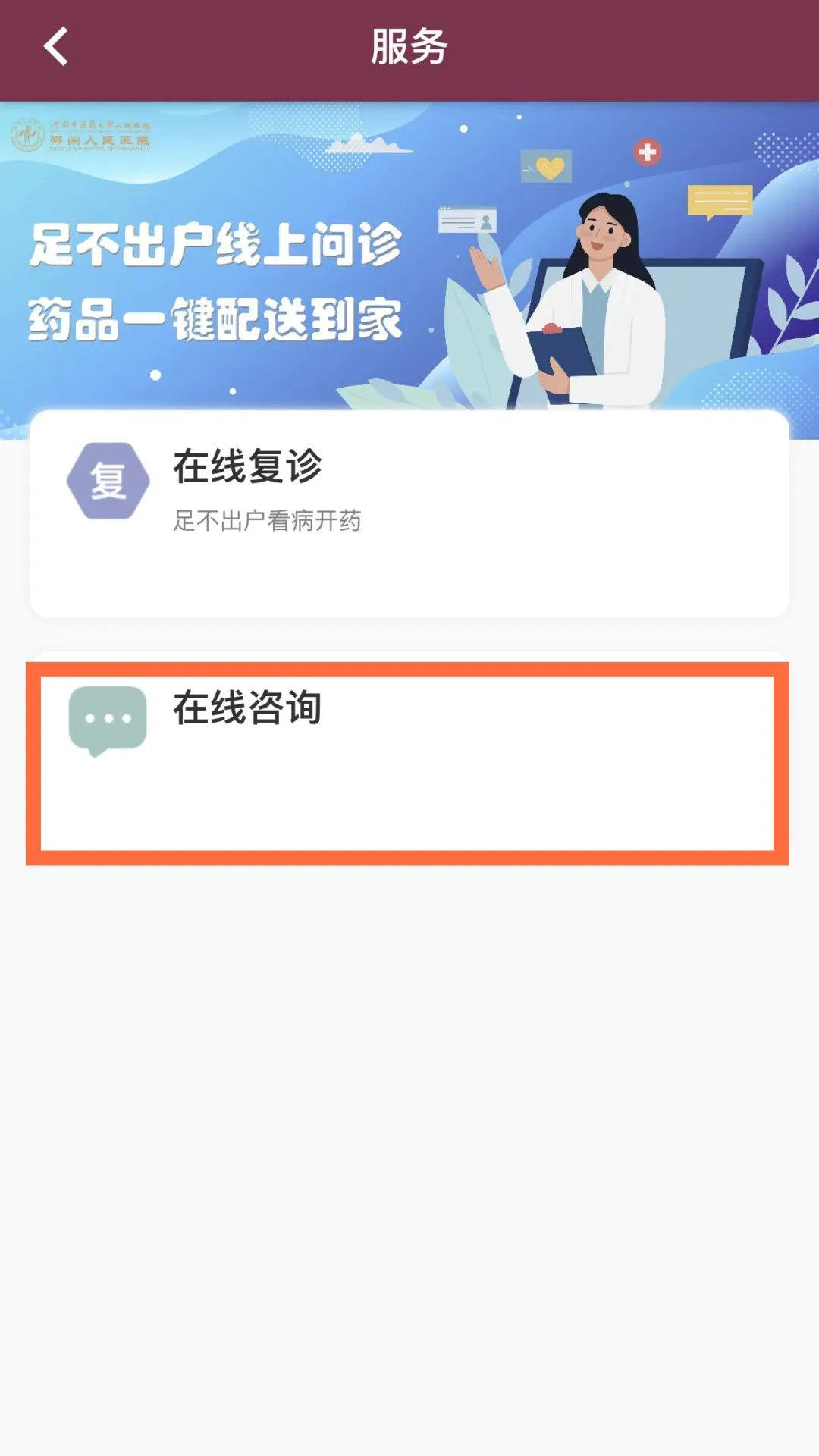 1、微信关注“河南省人民医院互联网医院服务号”→【在线问诊】进入问诊页面 。