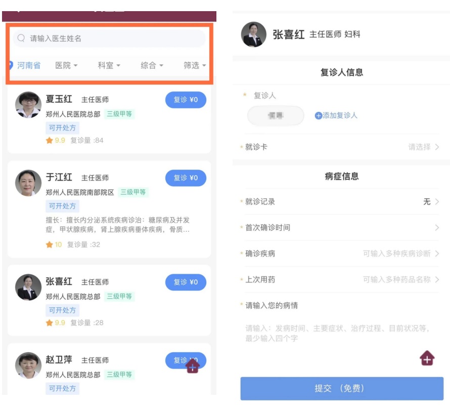 1、微信小程序搜索“郑大二附院互联网医院”进入问诊页面 ,点击妇科、产科等科室选择【医生列表】,选择专家进行问诊。