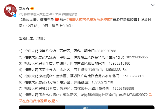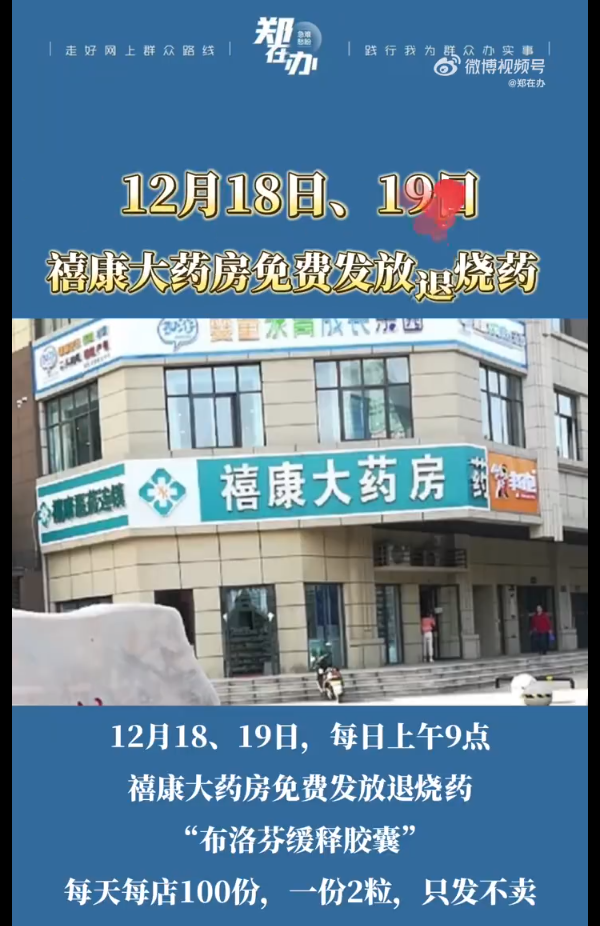 郑州禧康大药房免费发放退烧药布洛芬缓释胶囊,发放时间:12月18、19日,每日上午9点;