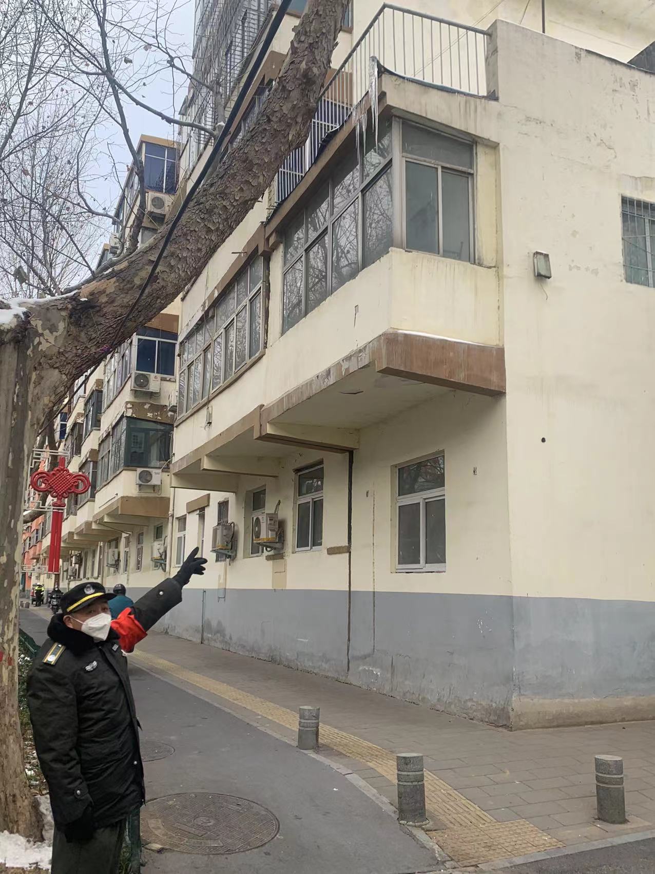 1月16日,在郑州市伊河路上干休所大门西侧二楼上方的排水管处,辖区执勤的巡防员看见冻着一些约一尺多长的冰柱,不少过路的市民从下面通行,存在很大安全隐患。巡防员接到情况反映后,急忙把险情反映给所辖社区人员处理隐患。