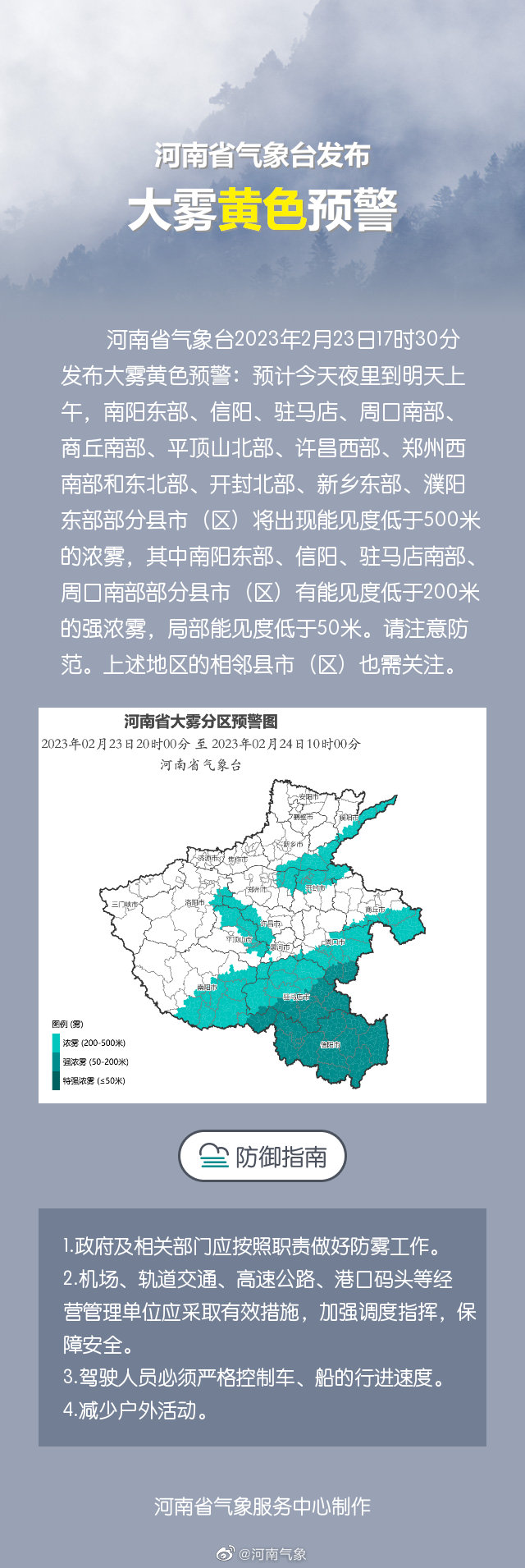 河南省气象台2023年2月23日17时30分发布大雾黄色预警:预计今天夜里到明天上午,南阳东部、信阳、驻马店、周口南部、商丘南部、平顶山北部、许昌西部、郑州西南部和东北部、开封北部、新乡东部、濮阳东部部分县市(区)将出现能见度低于500米的浓雾,其中南阳东部、信阳、驻马店南部、周口南部部分县市(区)有能见度低于200米的强浓雾,局部能见度低于50米。请注意防范。上述地区的相邻县市(区)也需关注。