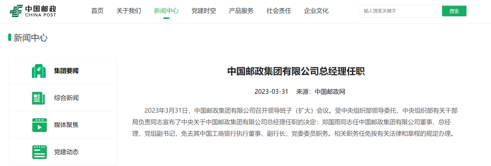 2023年3月31日,中国邮政集团有限公司召开领导班子(扩大)会议。受中央组织部领导委托,中央组织部有关干部局负责同志宣布了中央关于中国邮政集团有限公司总经理任职的决定:郑国雨同志任中国邮政集团有限公司董事、总经理、党组副书记,免去其中国工商银行执行董事、副行长、党委委员职务。相关职务任免按有关法律和章程的规定办理。