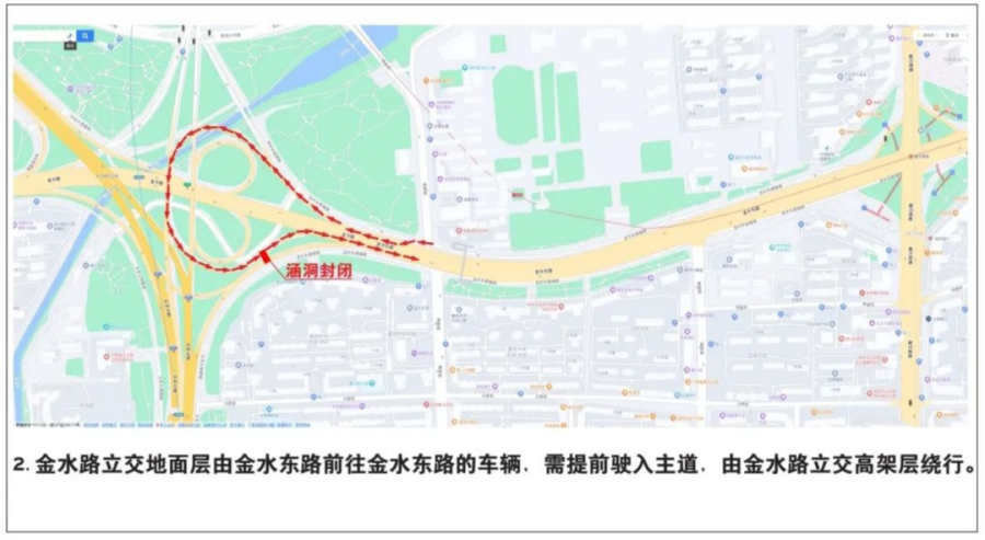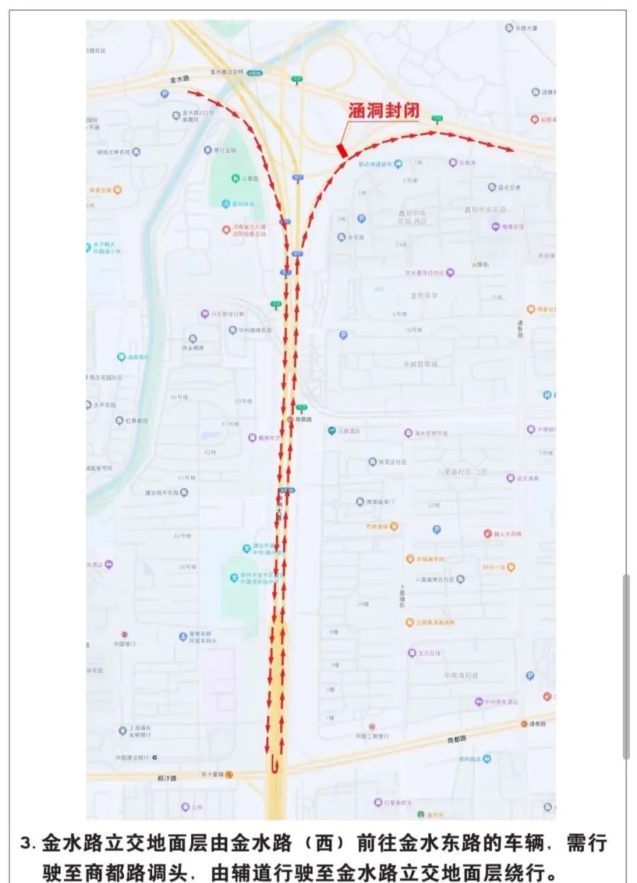 金水东路由东向西在涵洞调头向金水东路方向的车辆,请由金水路立交高架二层绕行。