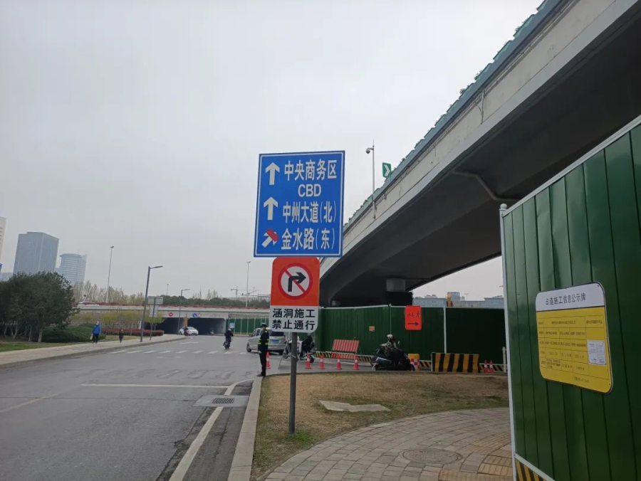 施工期间由中州大道南向东右转商鼎路未提前驶入辅道的车辆,请直行至金水东路绕行通泰路通行。