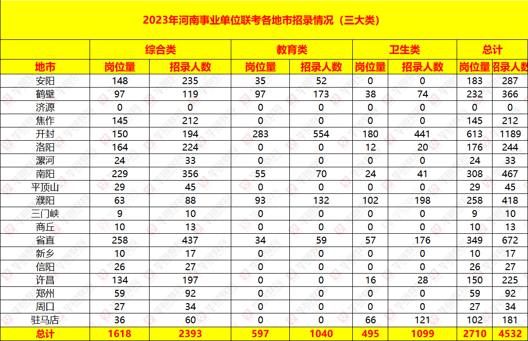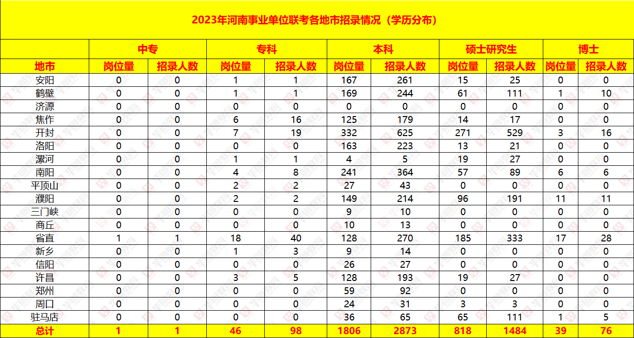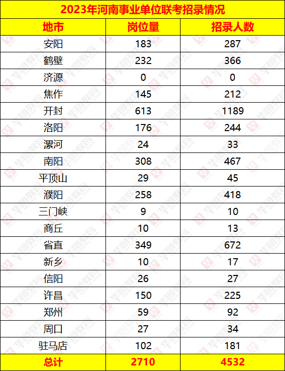 今年河南省事业单位联考共有27个省直单位及郑州市等17个省辖市参加。共有事业单位795家,招聘岗位2697个,招聘人数4505名。其中省直事业单位70家,招聘岗位356个,招聘人数672名;省辖市事业单位725家,招聘岗位2341个,招聘人数3860名。