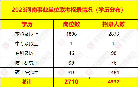 从今年河南事业单位联考的学历分布可见,本科学历是本次招录的主力,共招录1806个岗位,2873人,占比63%。研究生学历招录818个岗位,共1484人,占比33%。专科学历仅招录98人,占比2%。