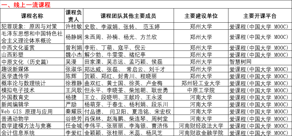 4月11日,教育部公示了第二批国家级一流本科课程认定结果,拟认定5751门课程为第二批国家级一流本科课程。其中,河南高校15门线上一流课程、9门虚拟仿真实验教学课程,111门线上线下混合式课程、35门线下课程、10门社会实践课程入选(战略支援部队信息工程大学未纳入统计)。