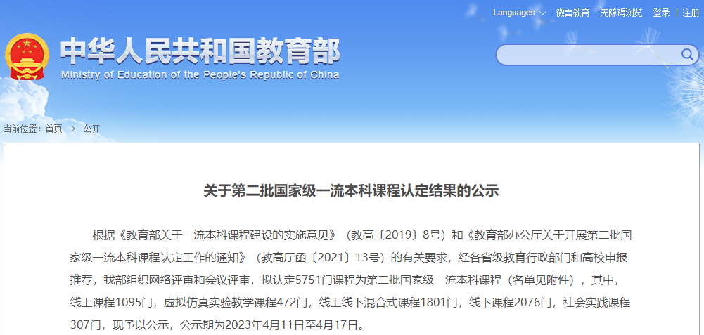 关于第二批国家级一流本科课程认定结果的公示