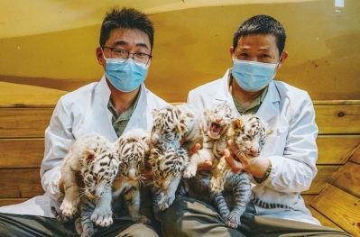本报讯 近日,郑州银基动物王国的白虎妈妈“静静”顺利产下白虎六胞胎——2只小公虎,4只小母虎。据了解,白老虎属孟加拉虎,通体白色带褐色条纹,是国家一级重点保护动物,通常一次只能生产1到4只小老虎,此次首次成功繁殖的白虎六胞胎,在国内十分罕见。