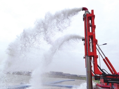 “该车辆是郑东新区现有最大排水能力的设备。相比传统排水机器1小时只能抽50多立方米,大功率‘龙吸水’1小时能抽3000立方米的水。”上述负责人介绍,这台3000型“龙吸水”子母式大流量排水抢险车具有自动化水平高、无需外接电源、操作简单、占地少等优点,大大提升了抢险速度和效率,可广泛应用于地下车库排涝、地下通道、高速公路隧道、涵洞、地铁、厂矿及其它低矮环境,以及不适宜人员进入的排水场合,为城市防汛抗涝提供了新的解决方案。在防汛应急演练现场,记者看到,两台10余米高的管道,正向远处喷出两股巨大的水柱,远远望去,宛如一条银白色的长龙。