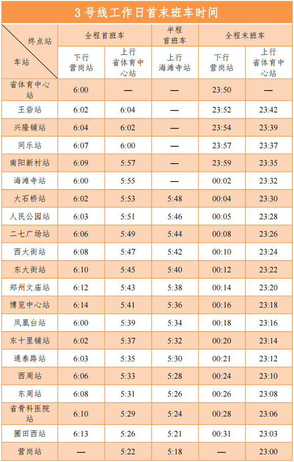 3号线首末班车时间详见下表↓