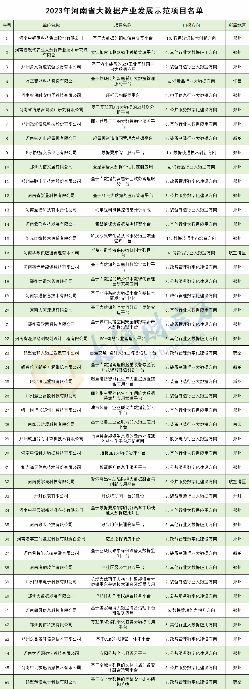 【大河财立方消息】9月12日,河南省工信厅公布了2023年河南省大数据产业发展示范项目名单,确定郑州多元智能装备股份有限公司“基于汽车装备的5G+工业互联网平台大数据应用”等46个项目列入2023年河南省大数据产业发展示范项目。