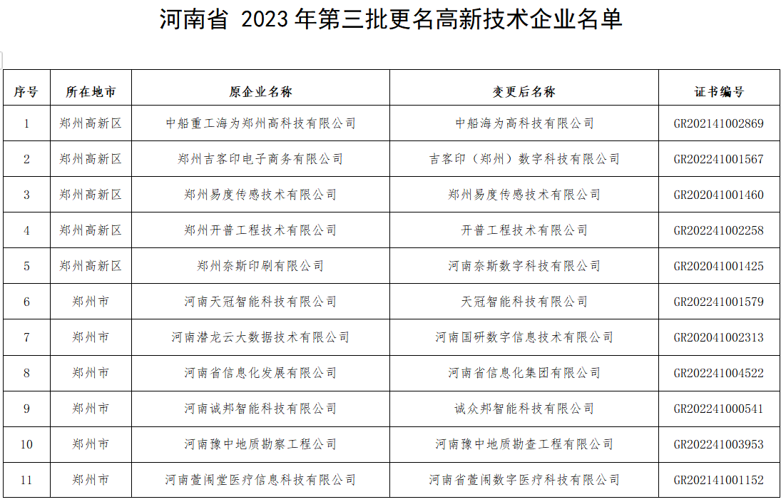 【大河财立方消息】11月10日,河南省科技厅公示河南省2023年度第三批拟更名高新技术企业名单,共涉及22家高新技术企业。公示期为10个工作日,自2023年11月10日至2023年11月23日。
