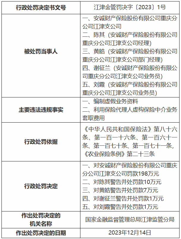 【大河财立方消息】12月19日消息,安诚财产保险股份有限公司重庆分公司江津支公司因编制虚假业务资料、利用保险代理人虚构保险中介业务套取费用,日前被国家金融监督管理总局江津监管分局处罚款198万元。
