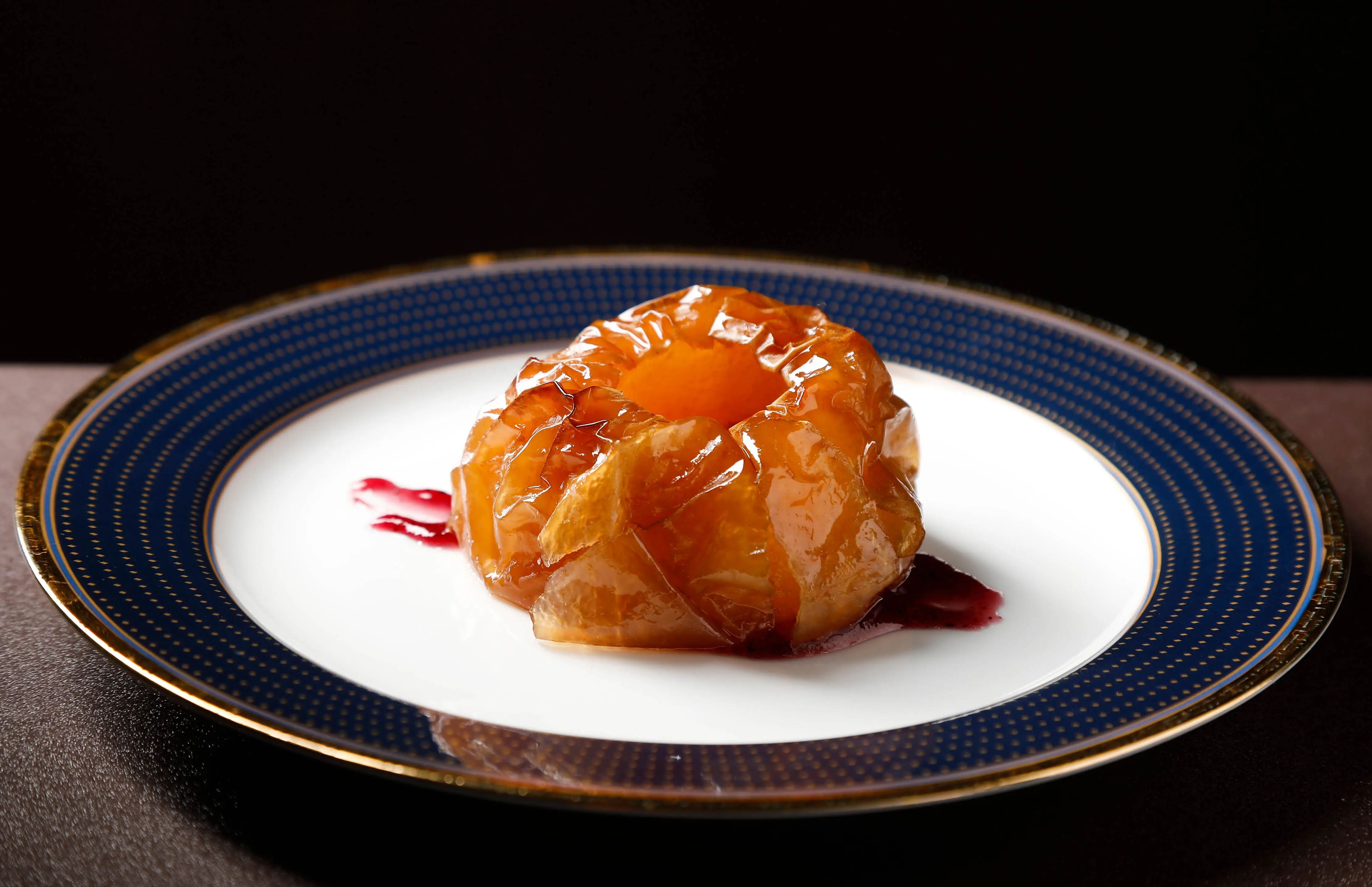 创新研发蜜汁烤灵宝寺河山苹果,“美拉德反应”赋予Fine-Dining的精致菜肴独特香气,每一口都仿佛在品尝云朵般绵软香甜。