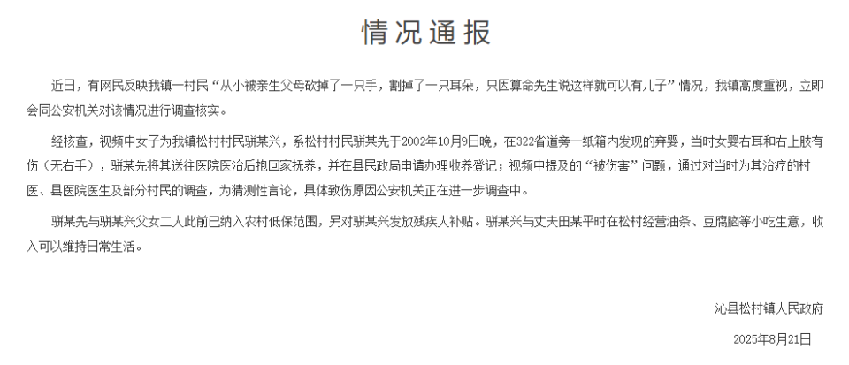 近日,有网民反映我镇一村民“从小被亲生父母砍掉了一只手,割掉了一只耳朵,只因算命先生说这样就可以有儿子”情况,我镇高度重视,立即会同公安机关对该情况进行调查核实。