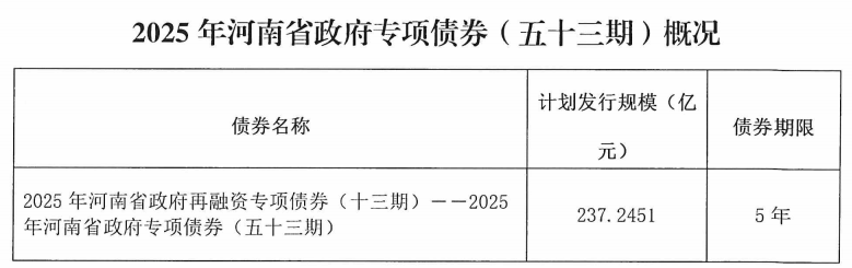 在国务院批准的总规模内,2025年河南省政府专项债券(五十三期)拟发行总额为237.2451亿元,品种为记账式固定利率附息债券,为5年期再融资专项债券,债券利息按年支付,发行后可按规定在全国银行间债券市场和证券交易所债券市场上市流通。该债券2025年9月2日招标,9月3日开始计息。