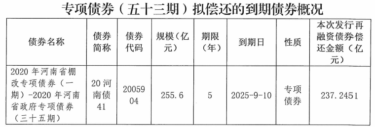 本次发行的专项债券(五十三期)237.2451亿元,用于偿还2020年河南省棚改专项债券(一期)-2020年河南省政府专项债券(三十五期)的部分本金。