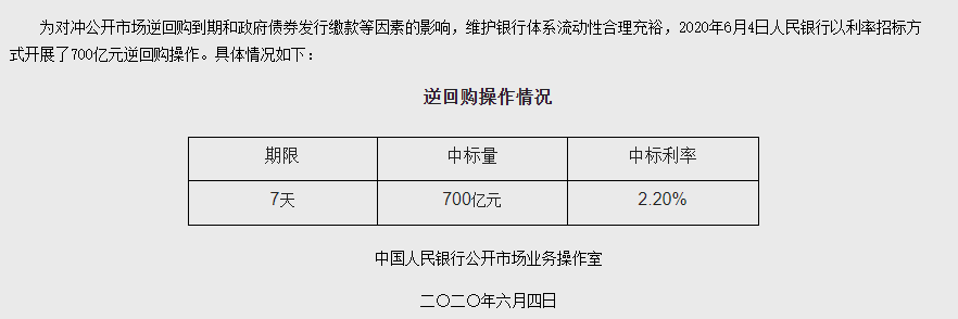 6月4日,央行发布公告称,为对冲公开市场逆回购到期和政府债券发行缴款等因素的影响,维护银行体系流动性合理充裕,今日央行以利率招标方式开展了700亿元逆回购操作,中标利率