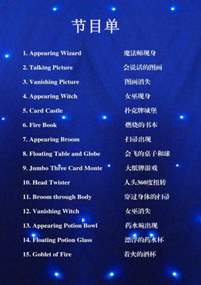 “魔法学校校长”在表演过程中将使用简单标准的英语,从而使节目具备了娱乐性和教育性双重功能。演出中,一名中国主持人将配合魔术师为观众解说和翻译……