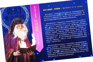 演出现场魔法学校的校长将从现场的小朋友中选出一些幸运儿,和他共同表演魔术节目,让孩子们体会到施展魔法的快乐, 其中会说话的图画、燃烧的书本、巨型魔术棒表演……