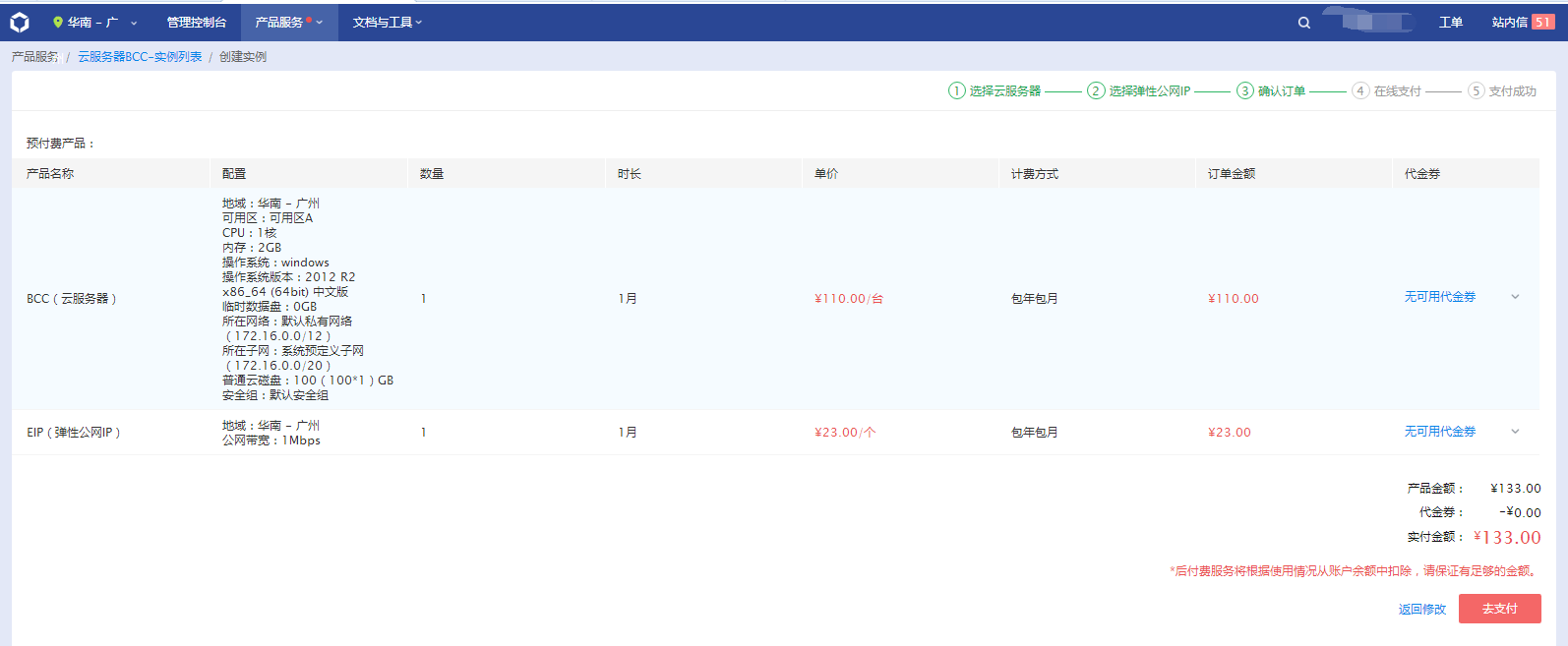 (1)认证成功后,就可以在百度云官网购买相关产品,并选择产品配置,如下图是选择云服务器的配置