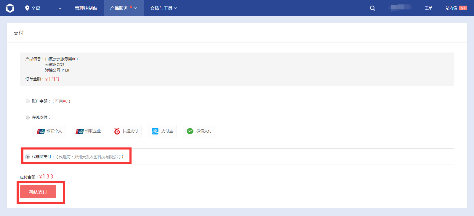 (2)点“去支付”,来到支付页面,选择“代理商支付”后,点“确认支付”。