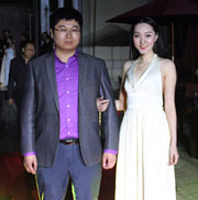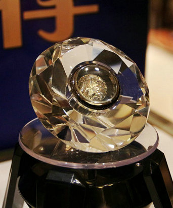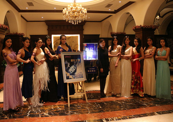河南一百度美人谈上线一周年庆典活动中模特佳丽与“世纪之恋”钻石合影