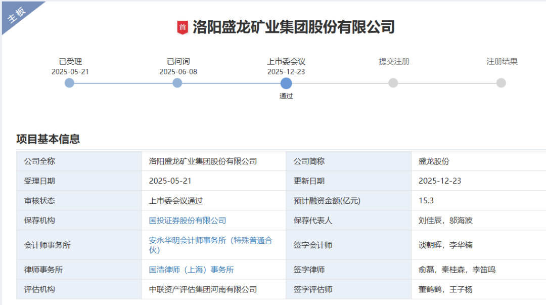 12月23日,深交所消息,洛阳盛龙矿业集团股份有限公司首发事项顺利通过深交所上市审核委员会审议。这一进展,标志着这家国内纯钼矿龙头企业登陆A股主板迈出关键一步,将为资