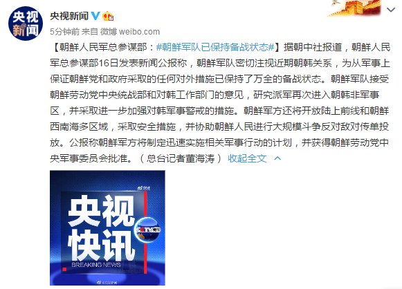据朝中社报道,朝鲜人民军总参谋部16日发表新闻公报称,朝鲜军队密切注视近期朝韩关系,为从军事上保证朝鲜党和政府采取的任何对外措施已保持了万全的备战状态。朝鲜军队接