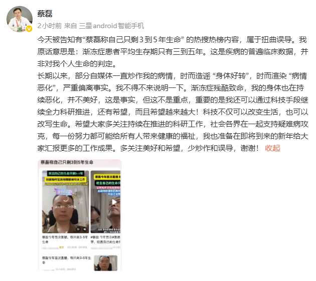 蔡磊表示,今天被告知有“蔡磊称自己只剩3到5年生命” 的热搜热榜内容,属于扭曲误导。自己原话意思是:渐冻症患者平均生存期只有三到五年。这是疾病的普遍临床数据,并非对