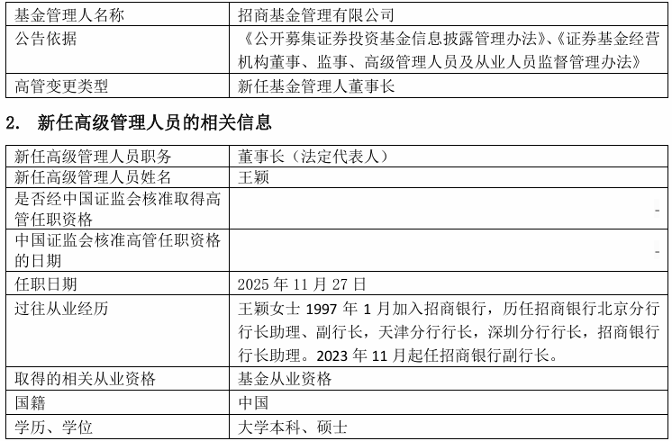 11月26日晚间,招商基金管理有限公司(简称招商基金)发布公告称,王颖任董事长,公司总经理钟文岳不再代任董事长职务。