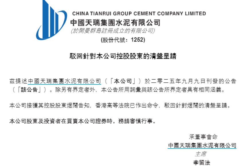 11月26日晚间,中国天瑞水泥发布公告称,接获其控股股东煜阔告知,香港高等法院已作出命令,驳回针对煜阔的清盘呈请。