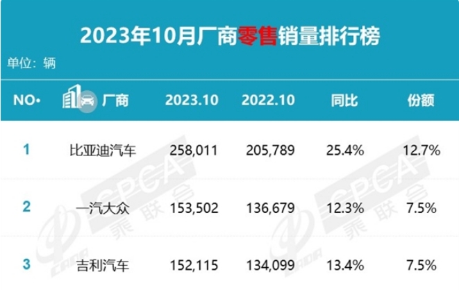 11月9日乘联会公布了10月份狭义乘用车的零售销量排行榜。数据显示,10月份国内狭义乘用车市场零售销量达203.3万辆,同比增长10.2%,环比增长0.7%;1-10月份累计销量1726.7万