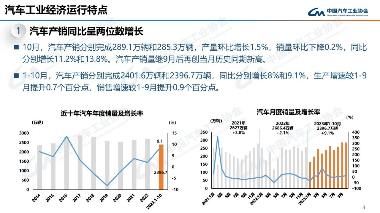数据显示,10月,全国汽车产销分别完成289.1万辆和285.3万辆,产量环比增长1.5%,销量环比下降0.2%,同比分别增长11.2%和13.8%。汽车产销量继9月后再创当月历史同期新高。1-10