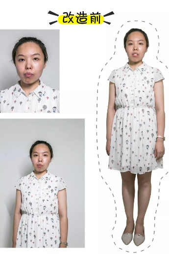 改造思路:晓阳同学整体很好不算胖,小腿又细又白,但是骨骼比较大,所以本期改造首选分体式裙装,或者高腰连衣裙,颜色搭配选择纯色,干净利落显修饰身材。晓阳同学眼睛基础很好,通过化妆,可以轻松实现柔情似水&御姐凝视。稍微修理下眉形就会柔和很多。