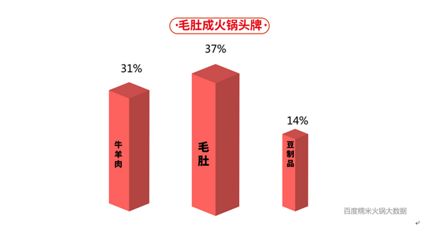 2015年,百度糯米火锅大数据显示,消费者在点菜时,毛肚的点击率占37%,而牛羊肉合计31%,第三位居然是豆皮占比14%,毛肚成了万人迷。