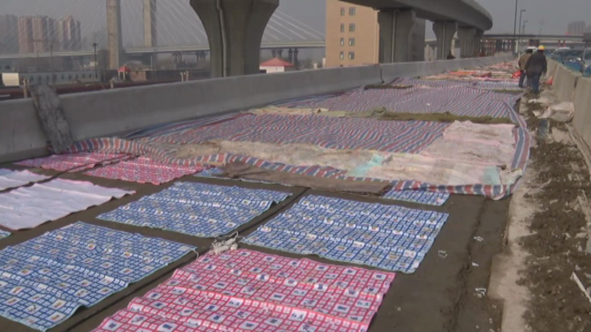 记者看到,大约两公里长的路面上,施工工人一共由南向北,一共铺了四列电热毯,总数有几千床,电热毯上面先用彩条布覆盖,然后再用被子盖住。而在匝道上方的桥面上,这样的路面还有几公里。