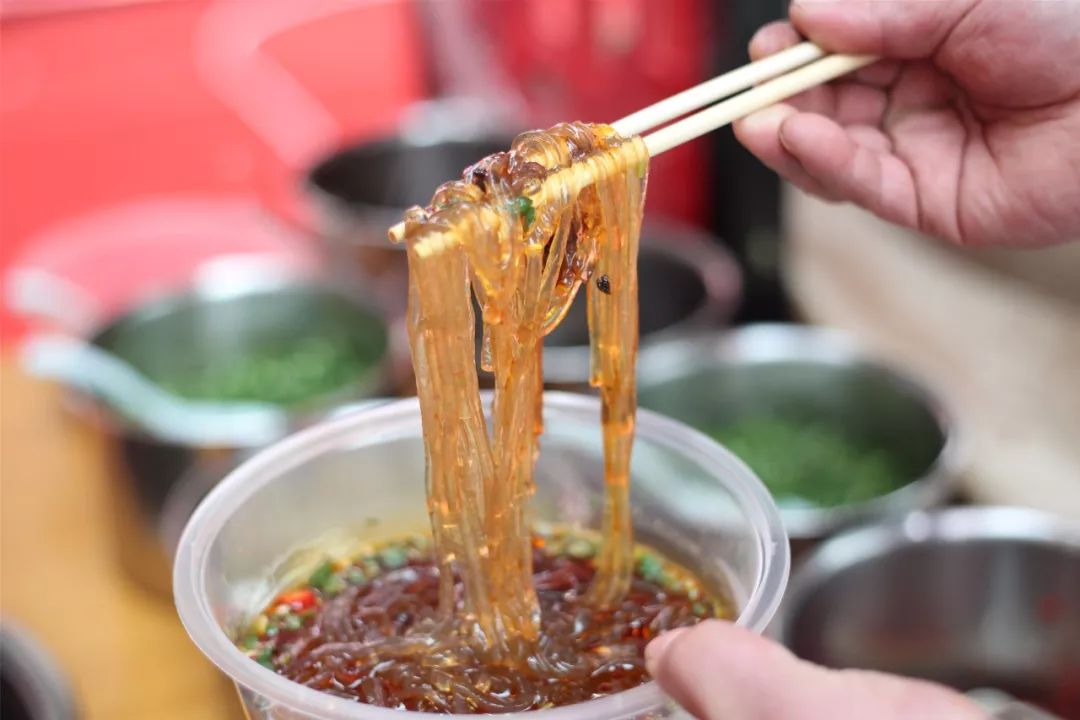 满天星肉丝带底使用纯绿豆手工制作的鲜粉皮。吃起来酸、辣、香、冲、爽、柔、弹、滑……唇齿留香,回味悠长。