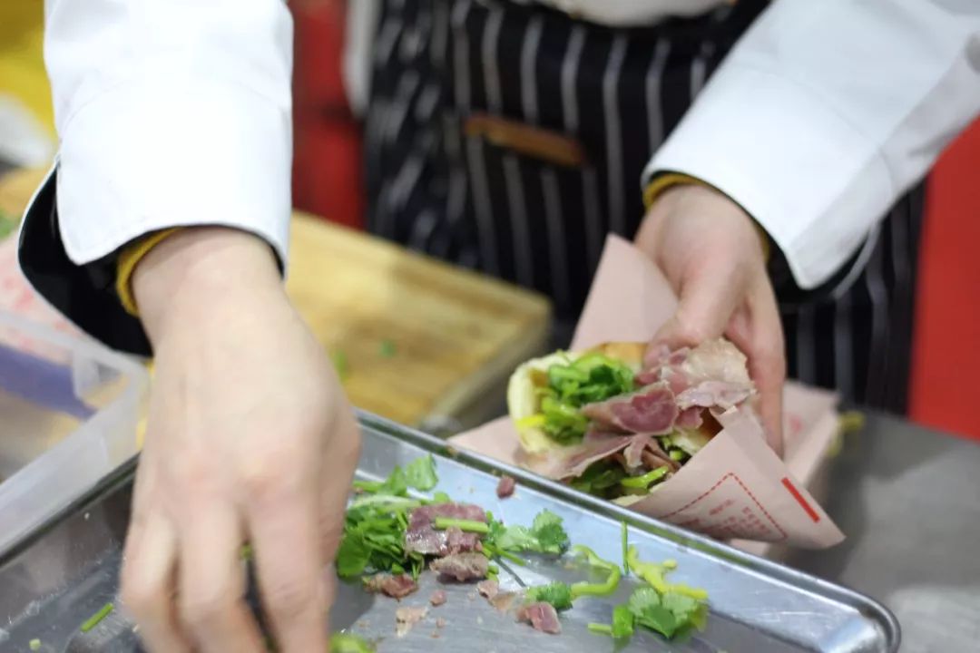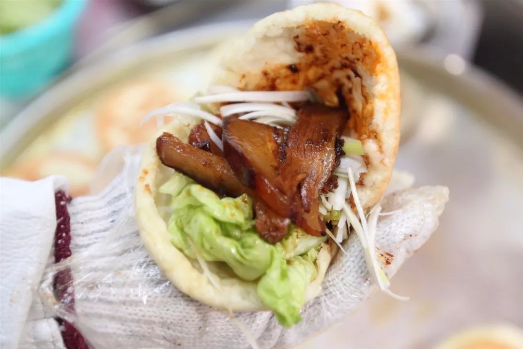 陈年老汤卤制的猪头肉放入现打现烧的饼子内,一口饼一口肉,好吃不是一点点!